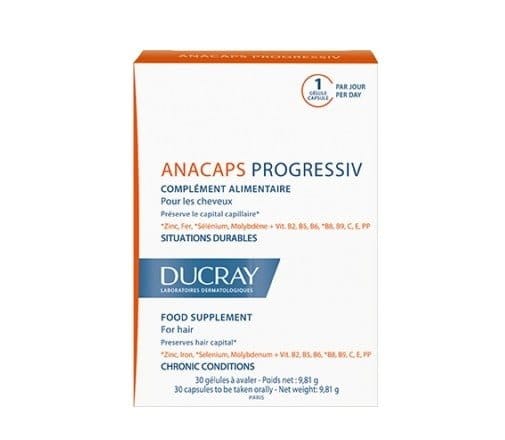 Anacaps Progressiv est un complément alimentaire spécialement adapté aux situations durables. Il préserve le capital capillaire et aide à conserver un cheveu en bonne santé sur la durée.