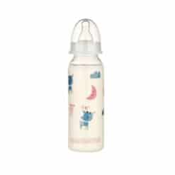 Le biberon est équipé d’une tétine ronde en silicone de taille standard pour bébés et enfants de 0 à 24 mois. La grande ouverture de la bouteille facilite le remplissage et le nettoyage. Une bague filetée avec un couvercle et un capuchon de protection sont également fournis.