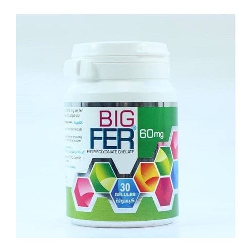 BigFer avec sa formule à base de Bisglycinate de Fer qui se compose d’une molécule de Fer ferreux liée à deux molécules de glycine, de sorte que le Bisglycinate de fer est mieux toléré que les autres molécules de fer,d’autre part, l’apport journalier en fer selon l’âge montre un besoin important en Fer, d’où l’intérêt de compléter cet apport journalier par BigFer avec ses deux présentations : BigFer 60 qui correspond à 12 mg de Fer, et BigFer 120 mg qui corresponds à 24 mg de Fer.