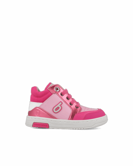 - Détails Métallisés : Des empiècements en cuir rose métallisé au niveau des œillets et du talon ajoutent une touche de brillance moderne.