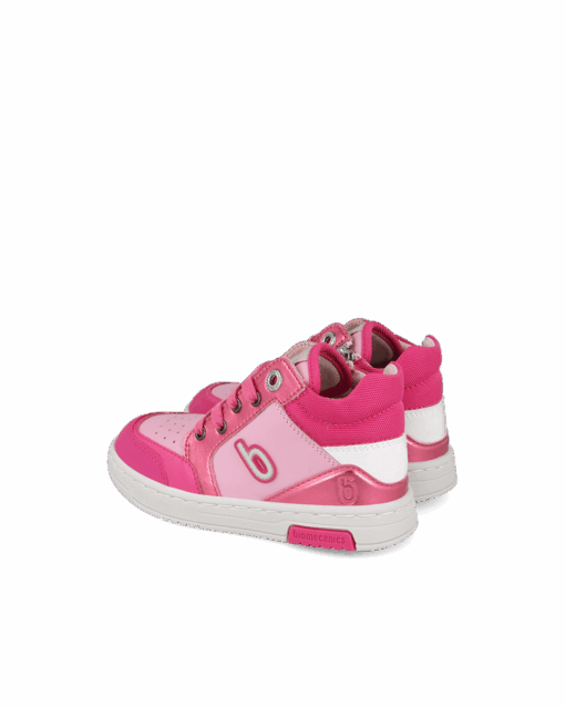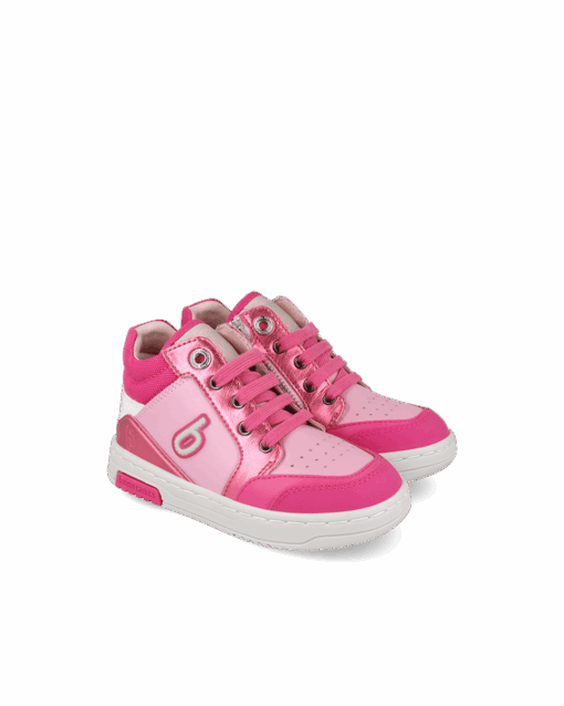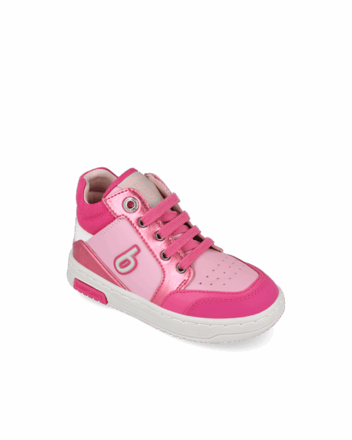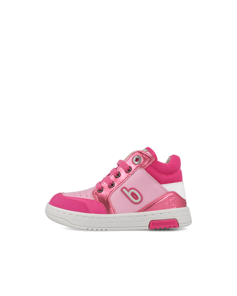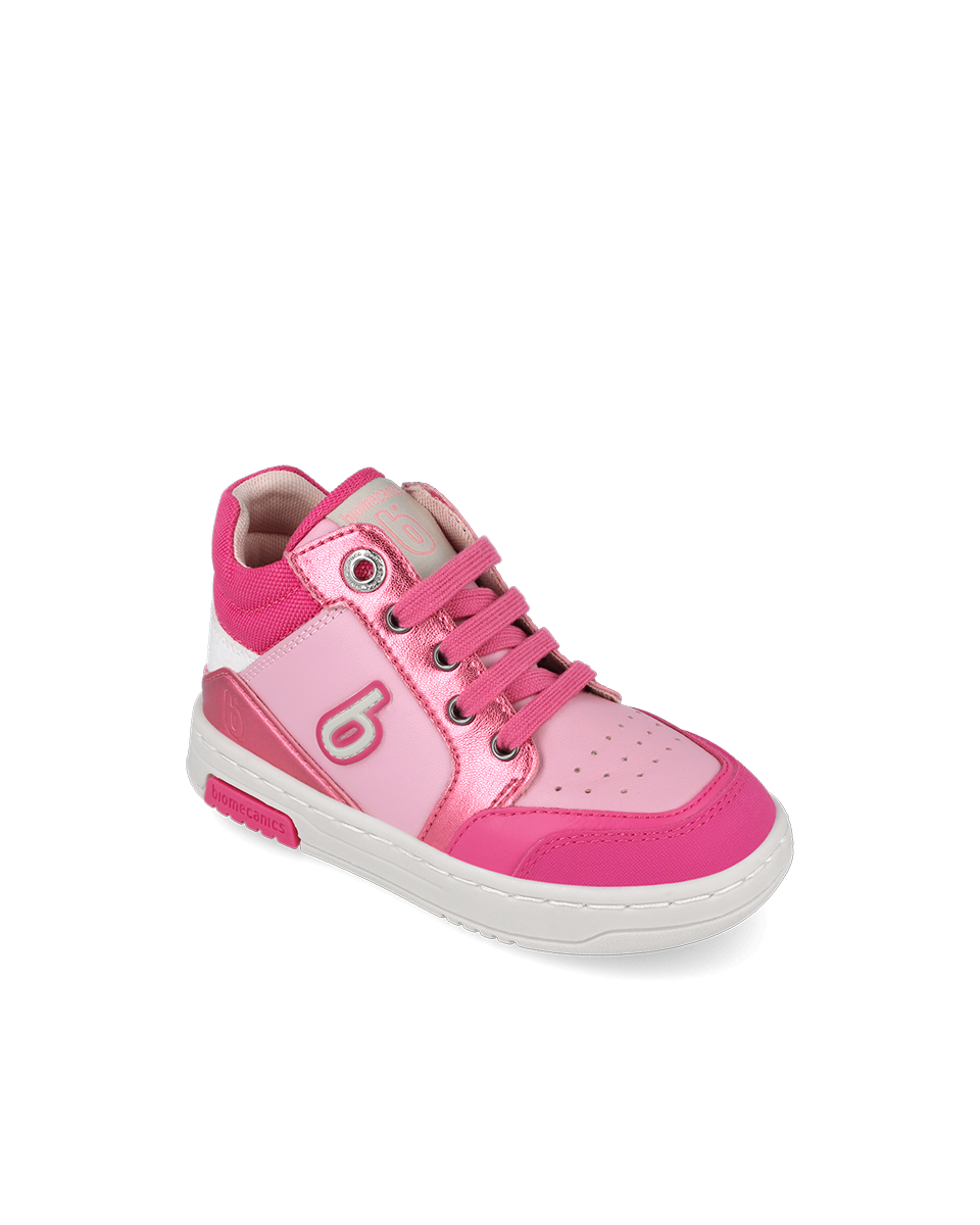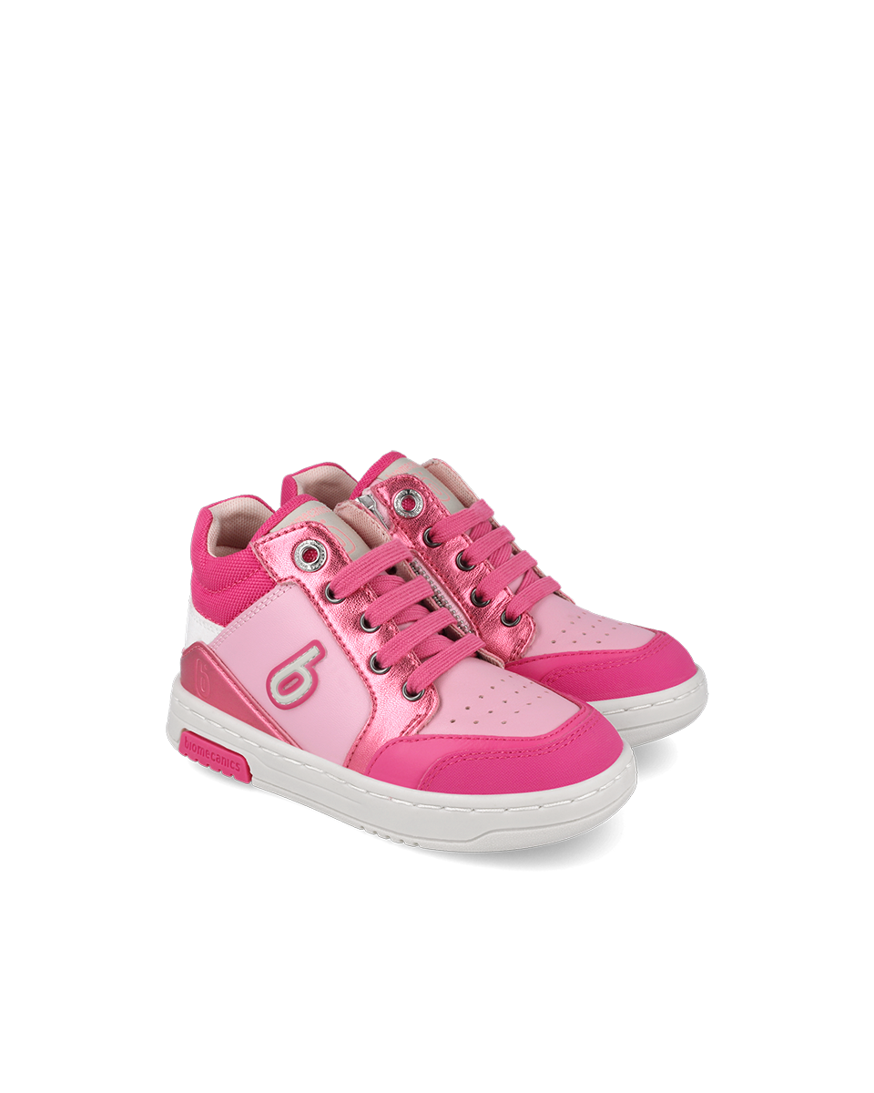 - Détails Métallisés : Des empiècements en cuir rose métallisé au niveau des œillets et du talon ajoutent une touche de brillance moderne.