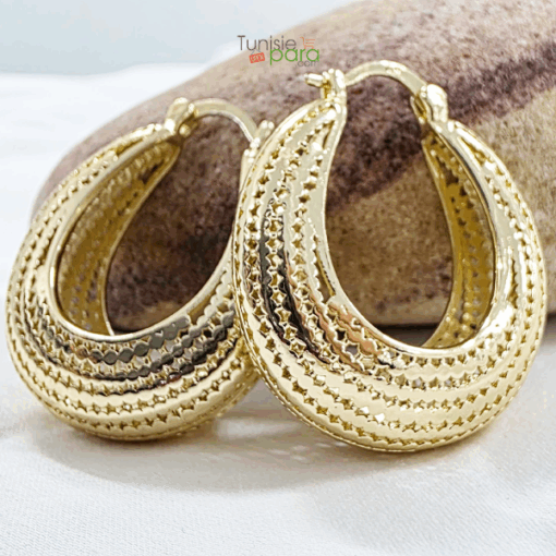Apportez une brillance incomparable à votre visage avec ces créoles “panier” au design sophistiqué, une pièce classique revisitée avec un travail de texture remarquable.