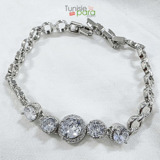 Ce bracelet se distingue par son design raffiné, mettant en avant une composition centrale de cristaux majestueux entourés de halos scintillants. C’est l’accessoire de prestige idéal pour sublimer une mariée, accompagner une tenue de soirée ou offrir un cadeau inoubliable.
