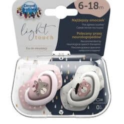 Les tétines au toucher léger ont été créées pour offrir un maximum de confort aux plus jeunes enfants. Leur caoutchouc de silicone extrêmement doux nécessite moins d’effort lors de la succion, et le bouclier léger et profilé n’alourdit pas la morsure et garantit une respiration libre, ce qui, selon les spécialistes, a un impact significatif sur le bon développement de la cavité buccale de l’enfant. ** Le porte-tétine pratique vous permet d’attacher la chaîne et de la donner facilement à votre bébé. Vous pouvez facilement garder les sucettes Light touche propres, grâce à un étui moderne qui peut être utilisé pour le stockage, mais aussi pour une désinfection rapide et pratique dans un four à micro-ondes. Un peu d’eau et 2 minutes suffisent pour garder les tétines hygiéniquement propres. Les tétines au toucher léger sont disponibles dans plusieurs collections uniques inspirées des tendances et dans différentes tailles – elles grandissent avec votre bébé.