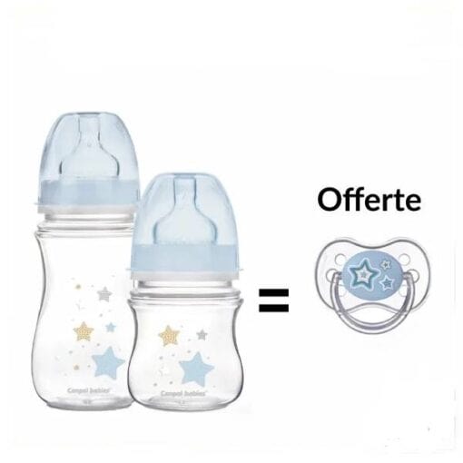 canpol pack 2 biberon anti colique col large PP nouveau né + sucette bleu