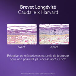 | Brevet Longévité (Caudalie x Harvard Medical School)* Activé par le resvératrol. Le brevet stimule les protéines de longévité Sirtuines x128** pour augmenter les performances de la peau et sa production de collagène, acide hyaluronique, élastine. *Brevet co-déposé avec Harvard University, N°FR21/04931. **Test in vitro sur les ingrédients. |