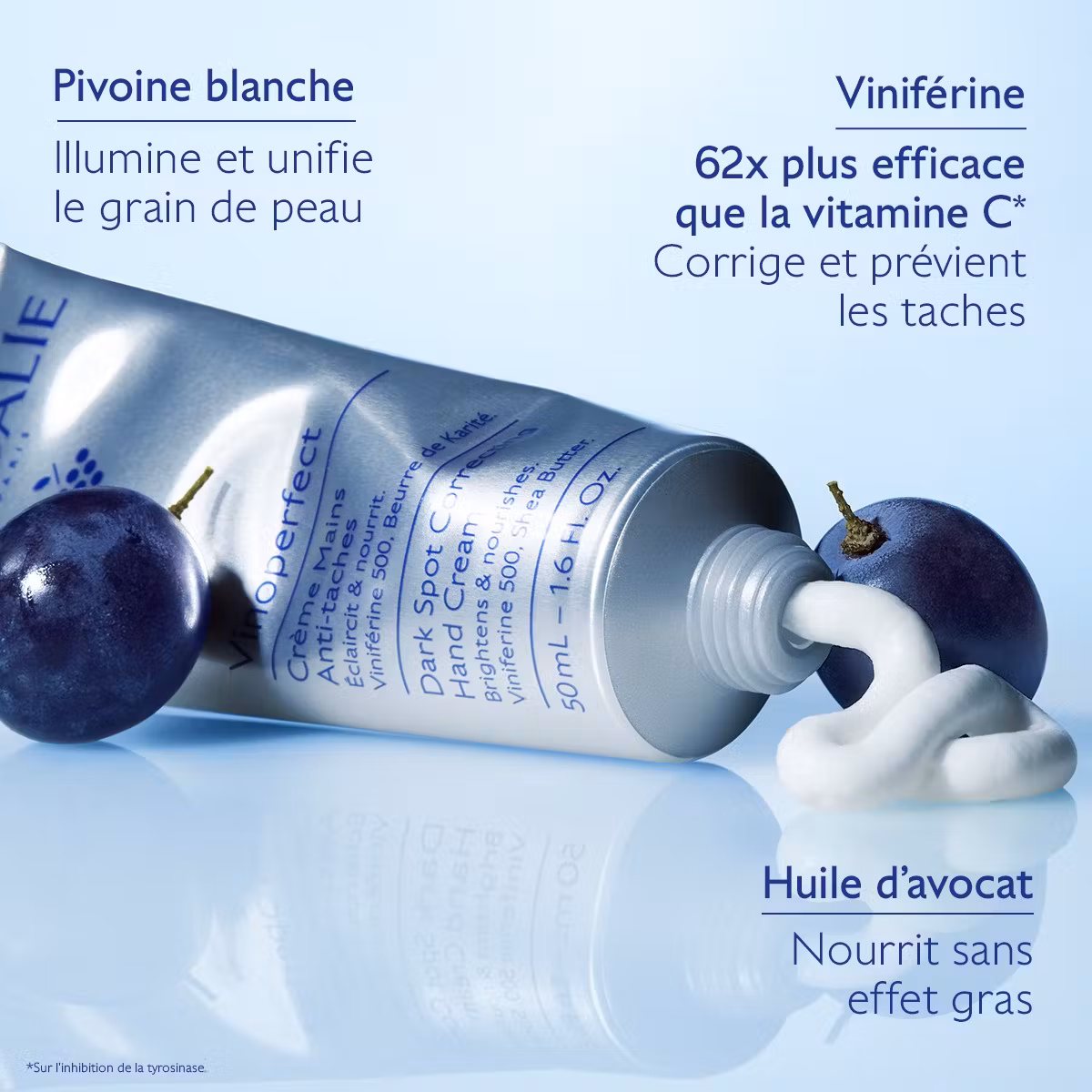 Enrichie en Viniférine, un actif naturel breveté issu de la sève de vigne, elle corrige efficacement les taches tout en illuminant la peau.