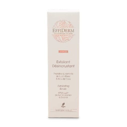 Utilisé une à deux fois par semaine, l’Exfoliant Désincrustant EFFIDERM® élimine en douceur cellules mortes, excès de sébum et impuretés, pour atténuer les rugosités grâce aux particules de coquilles de noix de coco tout en favorisant la régénération de l’épiderme grâce à l’Aloe vera et aux peptides de lupin blanc.