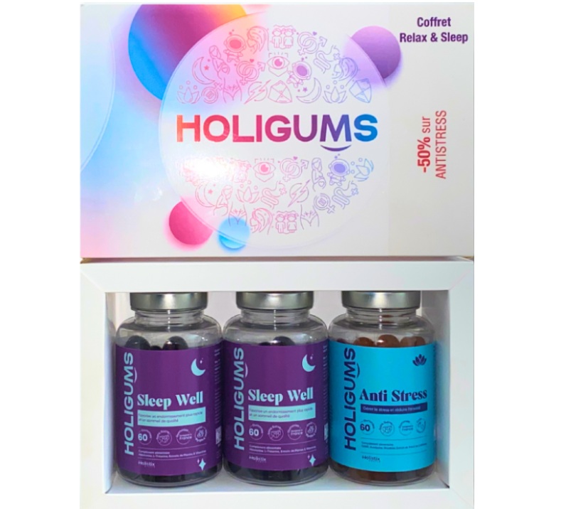 HOLIGUMS Sleep Well, un complément alimentaire vegan, sans sucre, à base de mélatonine, valériane, passiflore, mélisse, aubépine et théanine.