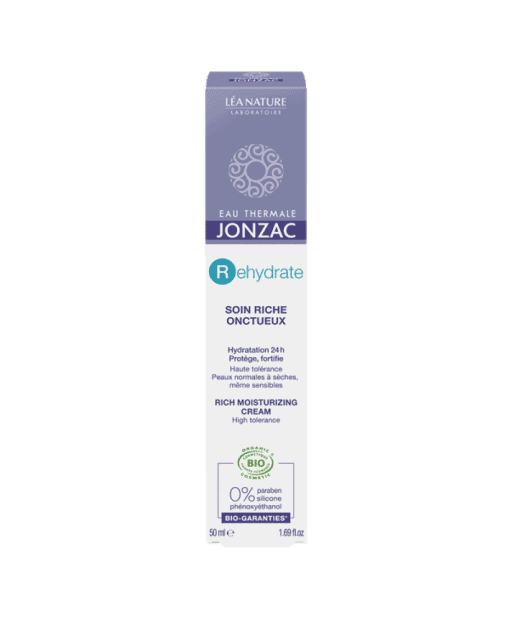 JONZAC REHYDRATE SOIN RICHE ONCTUEUX renforce le film hydrolipidique de la peau pour redonner souplesse et confort aux peaux normales à sèches. Enrichi en eau thermale de Jonzac, glycérine végétale et acide hyaluronique d’origine naturelle, le soin riche onctueux Rehydrate active immédiatement l’hydratation naturelle de la peau.