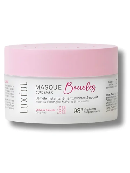 Luxéol Boucles Masque nourrit, répare et hydrate les cheveux bouclés, frisés ou crépus pour des boucles souples, brillantes et faciles à coiffer.