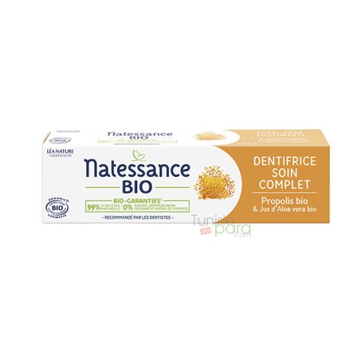 Natessance Dentifrice Soin Complet Propolis Bio 75 ml est un dentifrice enrichi en aloe vera Bio (aux propriétés apaisantes) et en propolis Bio (aux propriétés protectrices), conçu pour apporter une hygiène buccale quotidienne et complète. Il convient à toute la famille à partir de 7 ans.