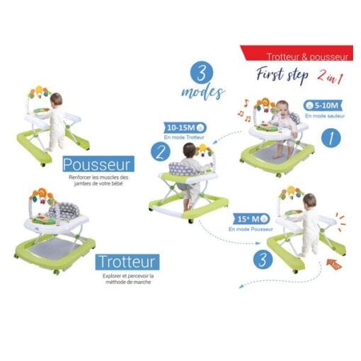 Trotteur PRIMA Pousseur 2EN1 Avec Volant, dispose d’une sécurité pour les escaliers avec fonction lumière, la musique et les sons. Réglable en hauteur sur 3 positions puis il peut suivre la croissance de votre bébé. Table à jouer Avec un amortisseur large et robuste (doux pour les meubles et les murs) et 6 arrêts solides pour les marches et les bords Couleurs : Bleu & Rouge & Gris Dispose d’une sécurité pour les escaliers avec une boite musical et 3 niveaux de hauteur. La marchette multifonctionnelle pour bébé est fabriquée en plastique de haute qualité respectueux de l’environnement, résistance à haute température.
