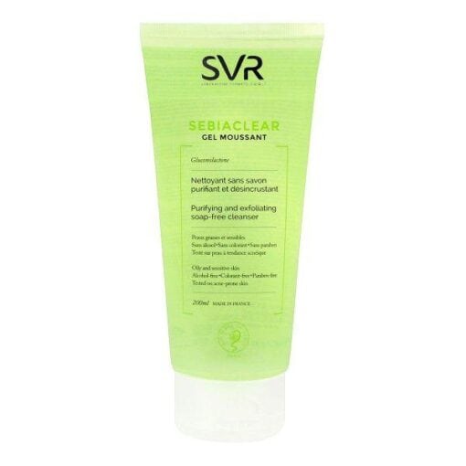 - SVR SEBIACLEAR Gel Moussant est un nettoyant sans savon qui est destiné pour les peaux grasses et sensibles.