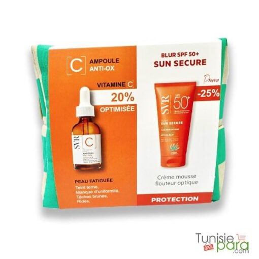 La trousse SVR associe deux soins essentiels pour les peaux ternes et fatiguées : l’Ampoule C Anti-OX, concentré en vitamine C pour réveiller l’éclat du teint, et Sun Secure Blur SPF50+, une crème solaire qui protège et unifie tout en floutant les imperfections.