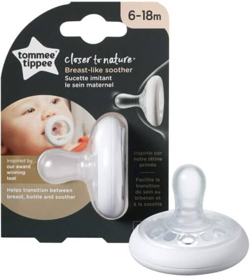 TOMMEE TIPPEE CLOSER TO NATURE BREAST LIKE SUCETTE fabriquée à partir de silicone super doux, cette sucette se sent, bouge, se plie et s’étire comme la peau afin qu’il y ait moins de risque de confusion lors de l’alimentation du bébé au sein ou au biberon. La sensation et la flexibilité naturelles de cette sucette en forme de sein, inspirée de notre tétine primée Closer to Nature, offrent une alternative rassurante aux sucettes traditionnelles. Parfait si vous craignez que le fait d’offrir une sucette à votre bébé puisse perturber l’allaitement au sein ou au biberon.