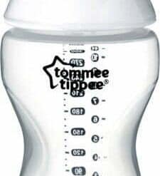TOMMEE TIPPEE CLOSER TO NATURE BIBERON avec une tetine en silicone doux et flexible comme la peau qui reproduit les mouvements naturels de la tétée lors de l’allaitement et une valve Easi-vent brevetée qui empêche l’accumulation de résidu de lait et permet la meilleure ventilation.